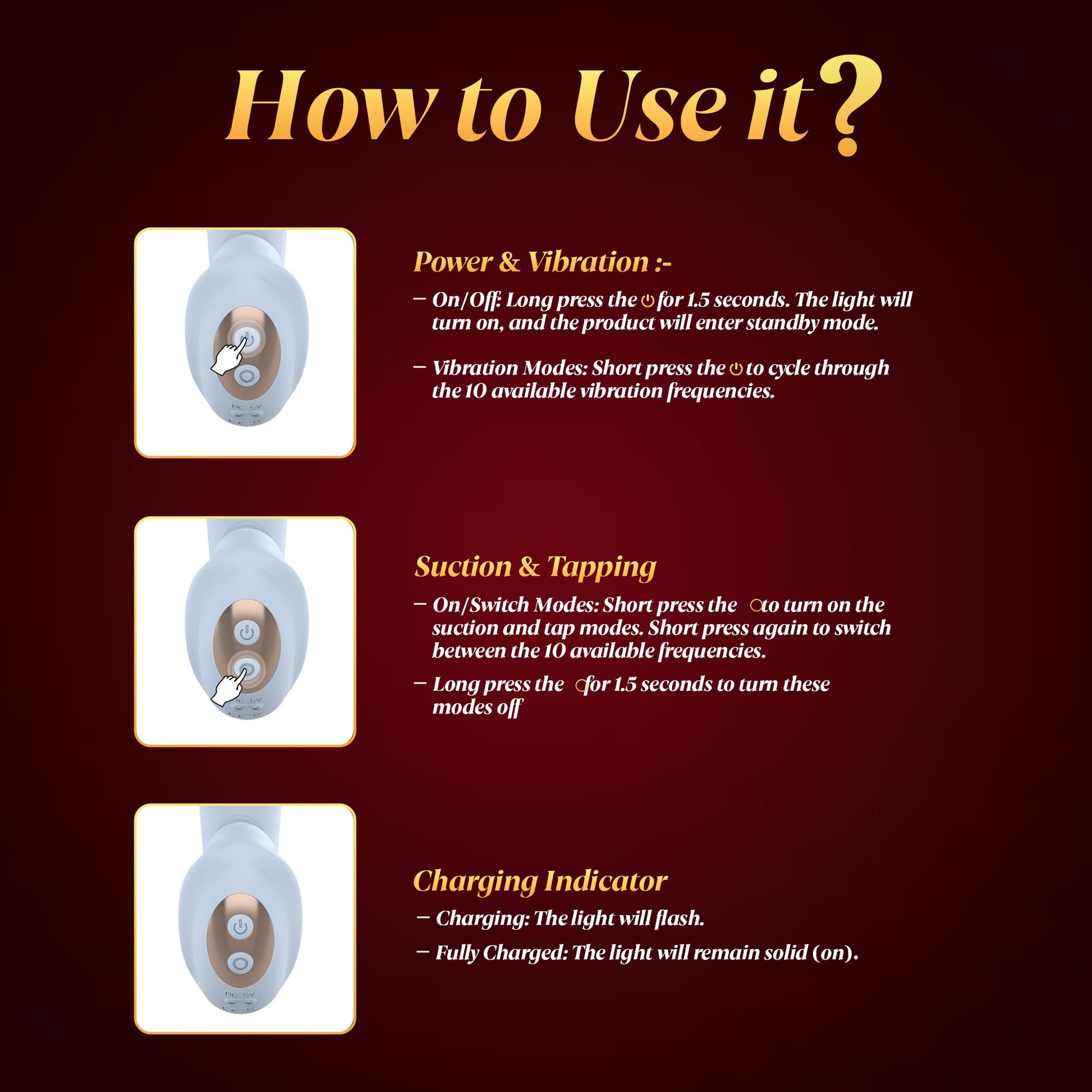 - 10 x 10 Modes: Mix and match 10 vibration frequencies with 10 suction/tapping modes. That’s 100 ways to find your "O."
